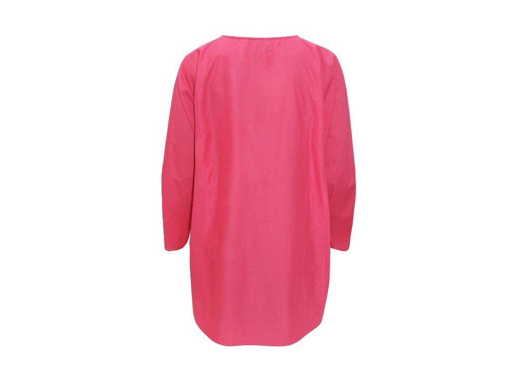 Dámská košilová halenka, barva červená. Střih volný, neobepíná. Kulatý výstřih se zapínáním na knoflíčky, zkrácené rukávy. Materiál jemné odlehčené plátýnko, příjemné na celodenní nošení - drží tvar, nevytahá se do stran. Rozparky na bocích cca 15 cm.