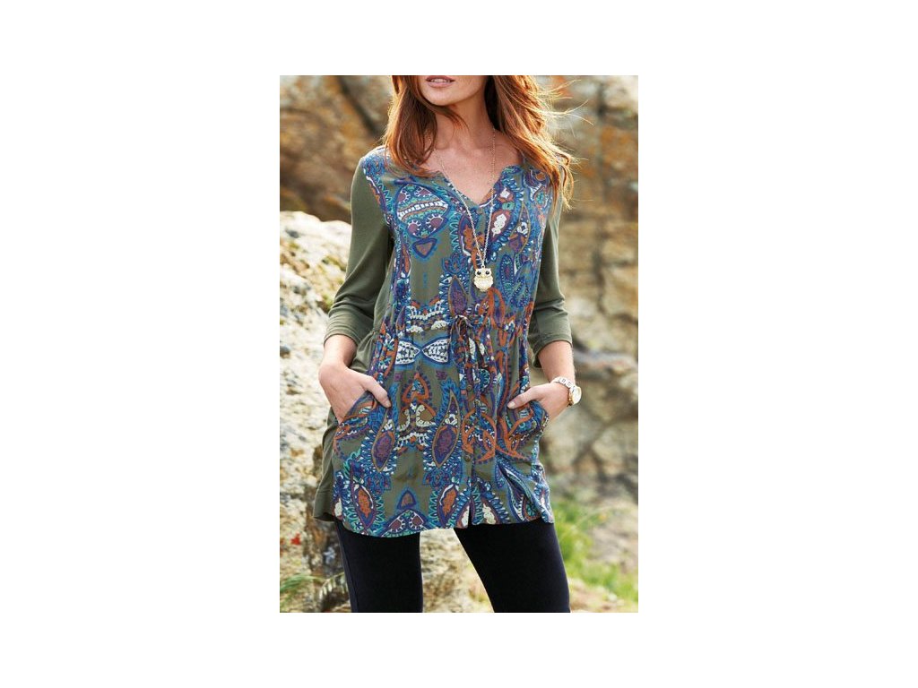 Dámská prodloužená košile - tunika. Propínací, dlouhý rukáv. Barva khaki + pestrý přední díl viz. fotografie. Tunýlek se šňůrkou v pase.