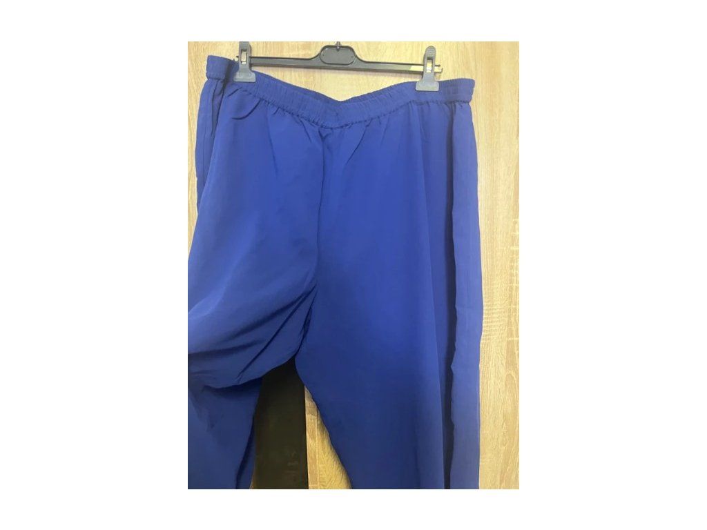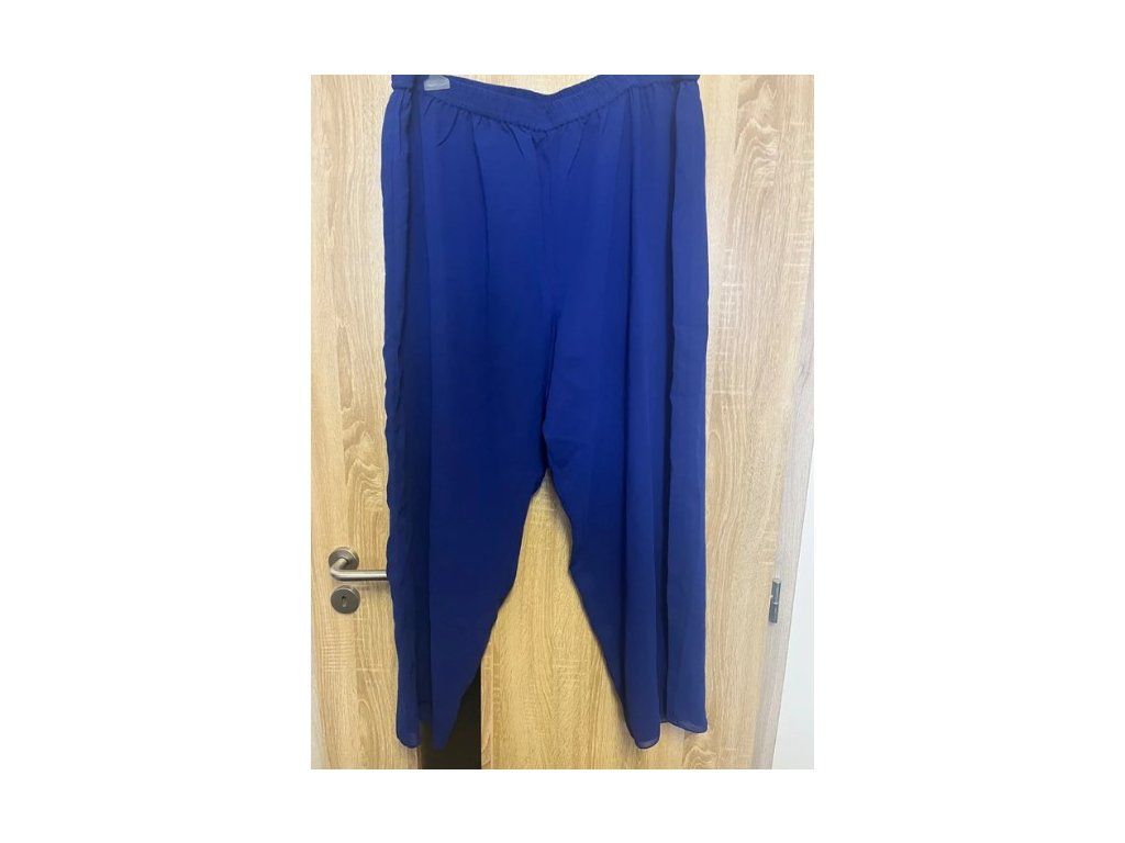 Dámské kalhoty, barva modrá. Volný vzdušný střih, ze 2 vrstev látky - vrchní průhledný šifon, spodní neprůhledná. Pas do gumy. Pohodlné na celodenní nošení.