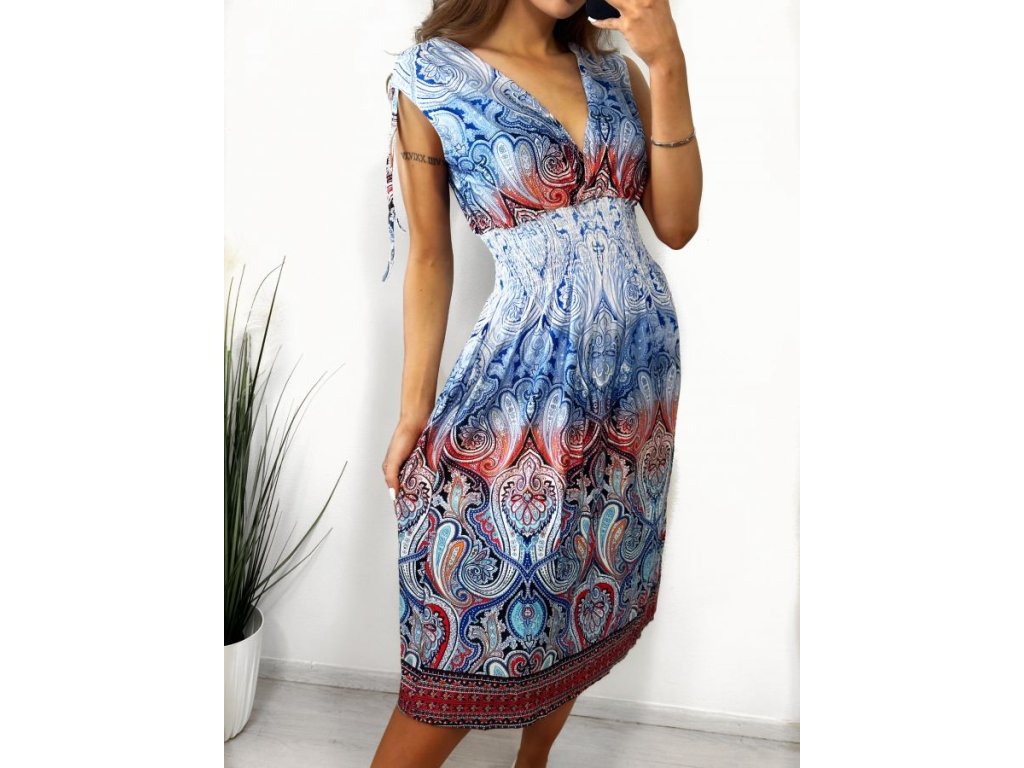 Letní šaty. Základní barva modrá. Široká ramínka - lze je stáhnout do úzkých, popř. nechat volně v šířce cca 12 cm.