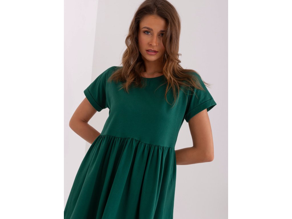 Tmavě zelené volánové šaty. Krátký rukáv, kulatý výstřih. Sukně volná, rozšířená, přes boky neobepíná.