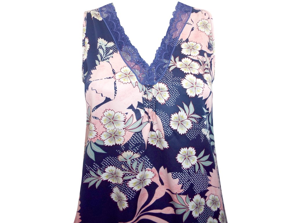 Dámská noční košile, barva navy modrá + potisk v tónech růžové, světle modré a bílé. Široká ramínka, výstřih do V s modrou krajkou.