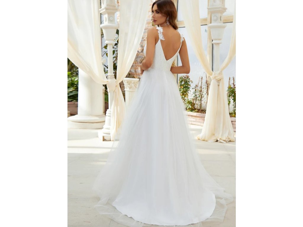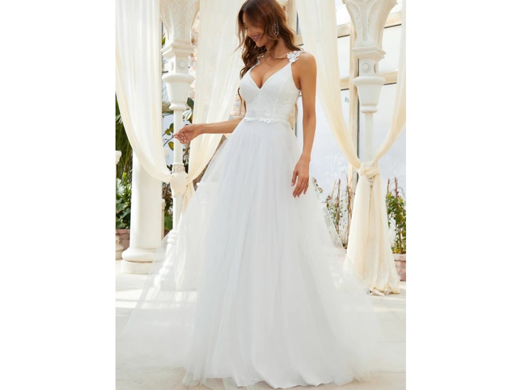 Dívčí / dámské dlouhé plesové šaty, barva bílá. Vhodné např. do tanečních na věneček, jako svatební atd. Vrchní díl kopíruje postavu, na ramínka. Zapínání vzadu na zip. Dlouhá sukně za 3 vrstev látky (spodní bílá neprůhledná, vrchní 2 z tylu. Sukně je dlouhá, splývá na zem (lze snadno zkrátit, tyl není nutné začistit, pouze ustřihnout). Tylová sukně je cca o 15 cm delší než spodní sukně.
